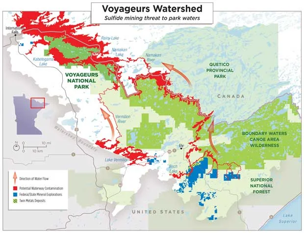 ““Voyageurs is at the downstream end of its watershed, so everything entering the watershed passes through it before reaching Canada. Mercury contamination, leaching of arsenic, or other acid mine drainage will pass through the park.””