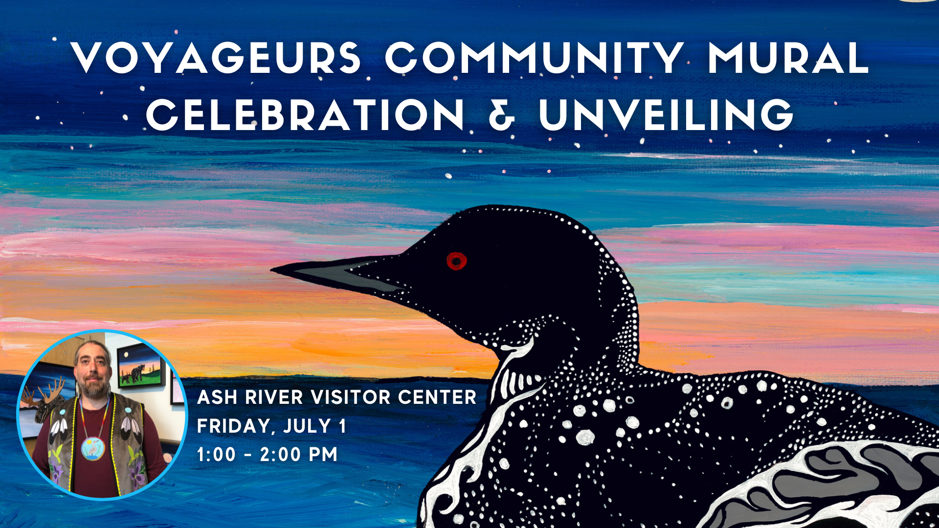 Celebrate the unveiling of the Voyageurs Community Mural with the National Park Service, Voyageurs Conservancy, and artist Sam Zimmerman. Meet Ojibwe artist and educator Sam Zimmerman and learn how the waters and skies of Voyageurs National Park, environmental stewardship, and traditional indigenous storytelling inspired this piece of artwork. This event is friendly for all-ages!