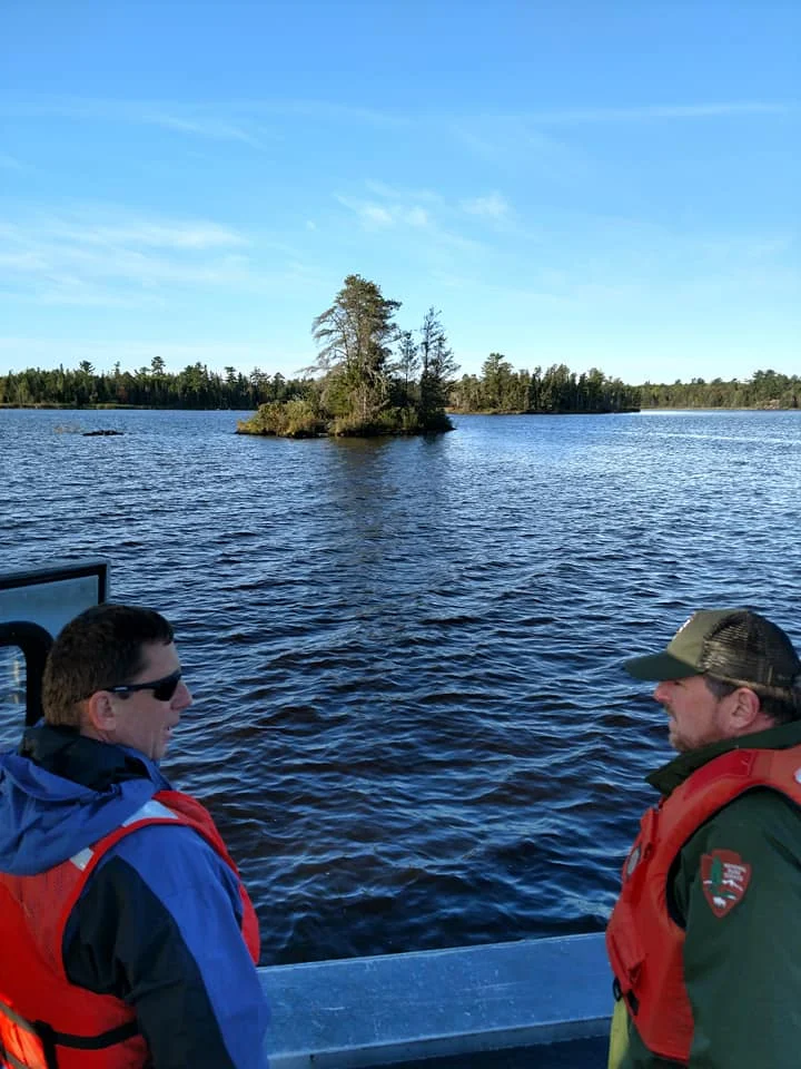 On Wednesday, September 25, 2019 Dean Gettinger, District Manager of the Bureau of Land Management's Northeastern States District; and Bob DeGross, Voyageurs National Park Superintendent, conducted a site visit to Bureau of Land Management (BLM) lands recently transferred to the national park. The former BLM lands, a series of small islands and parcels within the authorized boundary of Voyageurs National Park totaling 63 acres, were transferred to the National Park Service in March, 2019 when President Trump signed into law the John D. Dingell, Jr. Conservation, Management, and Recreation Act.