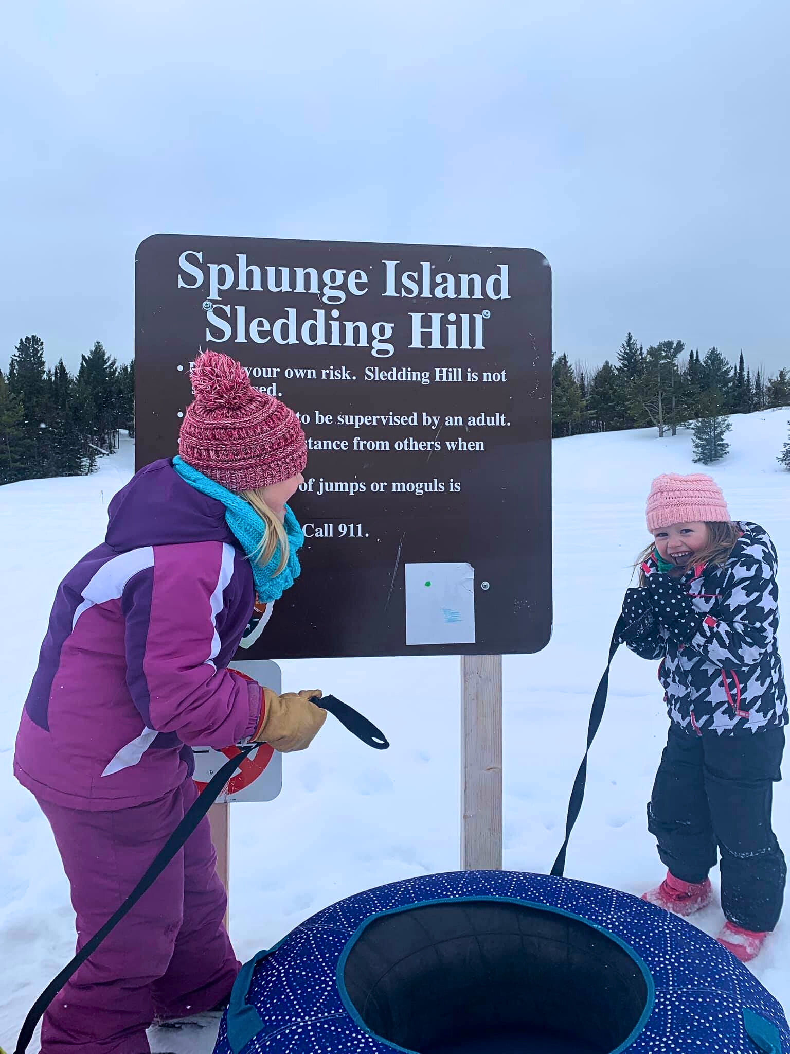 Did you know Voyageurs has an official sledding hill? The Sphunge Island Sledding Hill is open and accessible from the Kabetogama Lake Ice Road complete with picnic tables, a fire ring, and a skating rink! The sledding hill consists of a small hill for younger children and a larger hill for older children and adults. To access the sledding hill and skating rink, take the Kabetogama-Ash River Ice Road from the Kabetogama Lake Visitor Center (closed in the winter). The Sphunge Island sledding hill opens annually once there is sufficient snowfall and the ice road gets plowed on Kabetogama Lake. The skating rink is open and maintained as conditions allow.