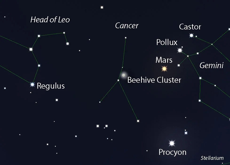 Our featured constellation is Cancer the crab, a faint, sparse group of stars tucked between the bright “backwards question mark” that outlines Leo’s head and the bright stars Castor and Pollux in Gemini. You’ll need a dark sky with as little moon as possible to make out Cancer, which is shaped like an upside-down letter Y. Cancer has one of the finest binocular star clusters in the sky, named the Beehive. It’s smack dab in the middle of the constellation not far from Mars. Take a look.
