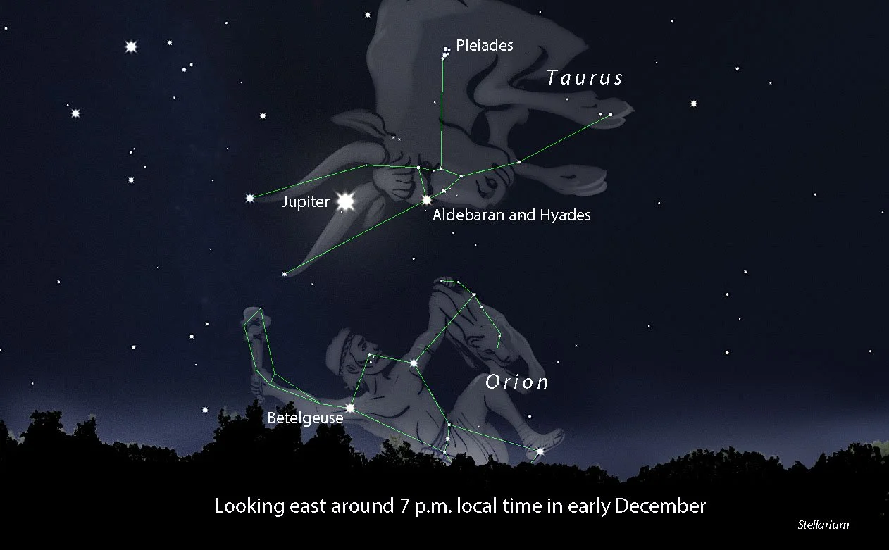 Dec. 7 – Jupiter brightest and closest to Earth for the year. The biggest planet is in Taurus the Bull to the left of Aldebaran and the V-shaped Hyades star cluster. Opposition means it’s opposite the sun in the sky, rising in the east when the sun sets and setting the following morning around sunrise.