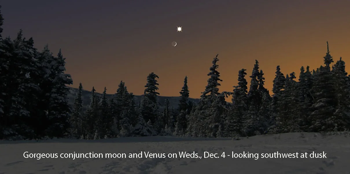 Dec. 4 – Pretty conjunction of the crescent moon and Venus this evening. They pair up in the southwestern sky at dusk about 2.5 degrees apart. Binoculars will easily corral the duo in the same field of view. Look 45 minutes to an hour after sunset.