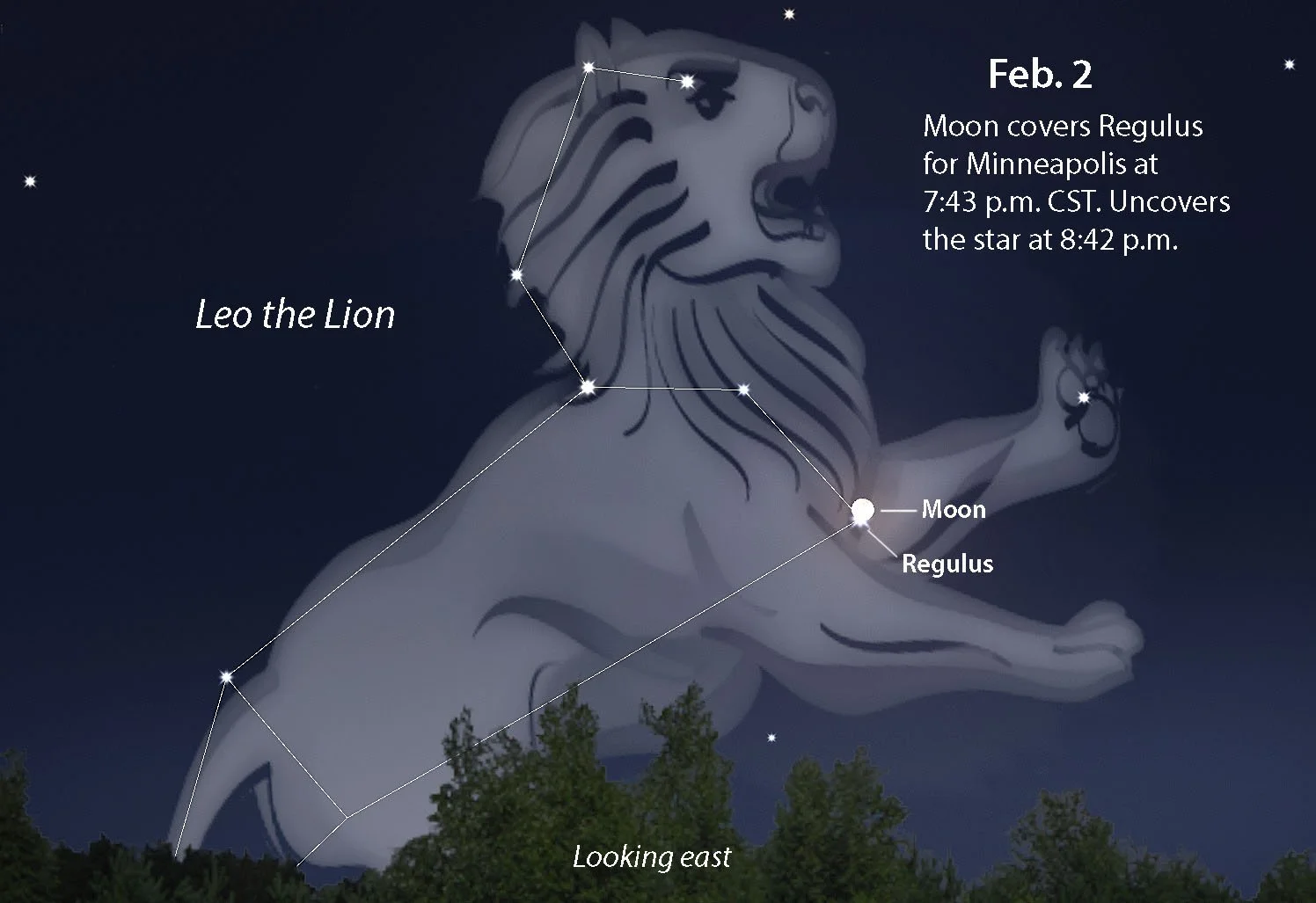 Feb. 2 – Nearly full moon occults Leo’s brightest star Regulus. For a list of times when the moon covers and then uncovers the star, go to lunar-occultations.com/iota/bstar/0203zc1487.htm and scroll up to find your city. The times given are Universal Time (UT), so remember to subtract 5 hours for EST, 6 for CST, 7 for MST and 8 for PST and move the calendar date back one to Feb. 2.