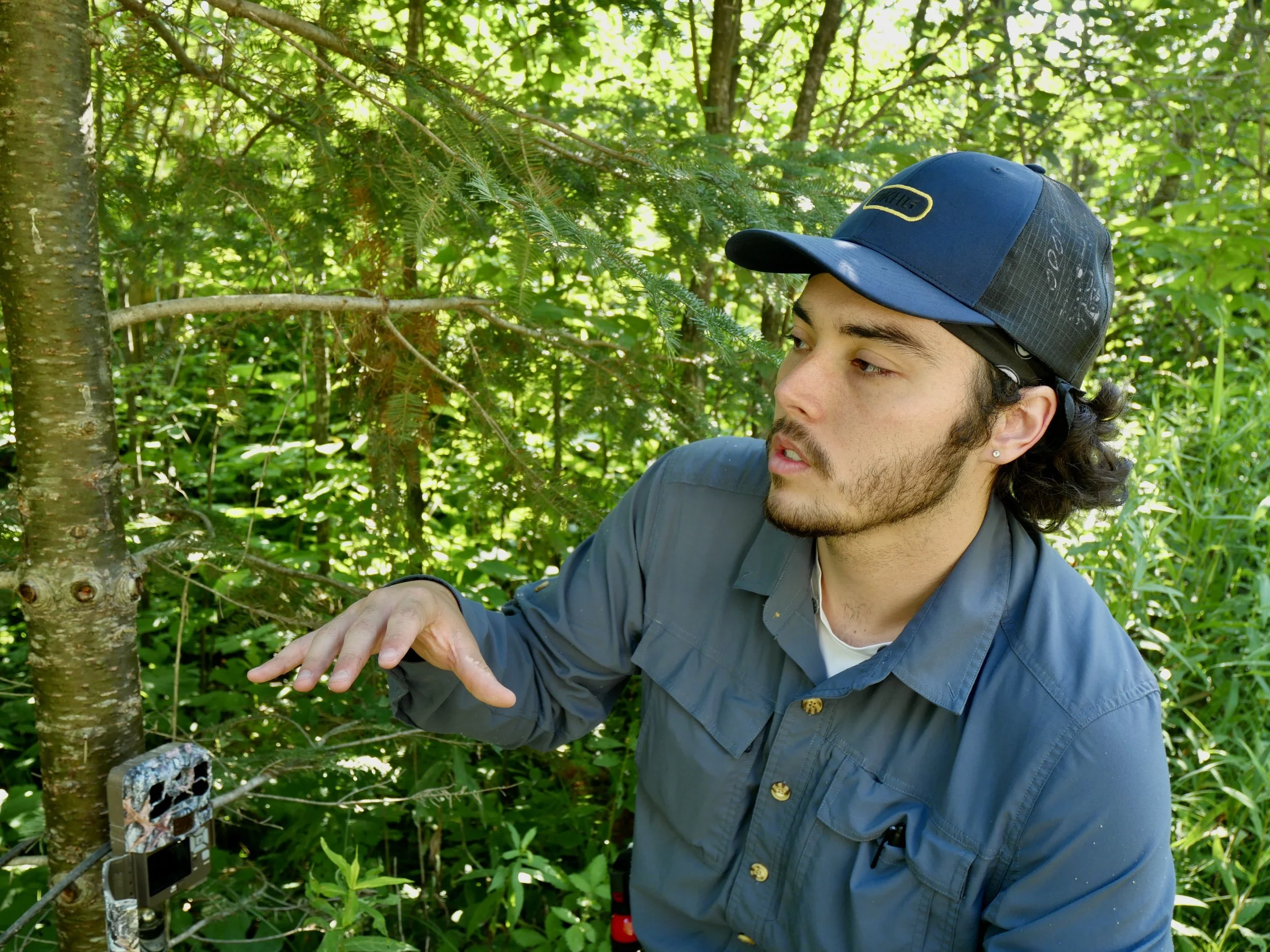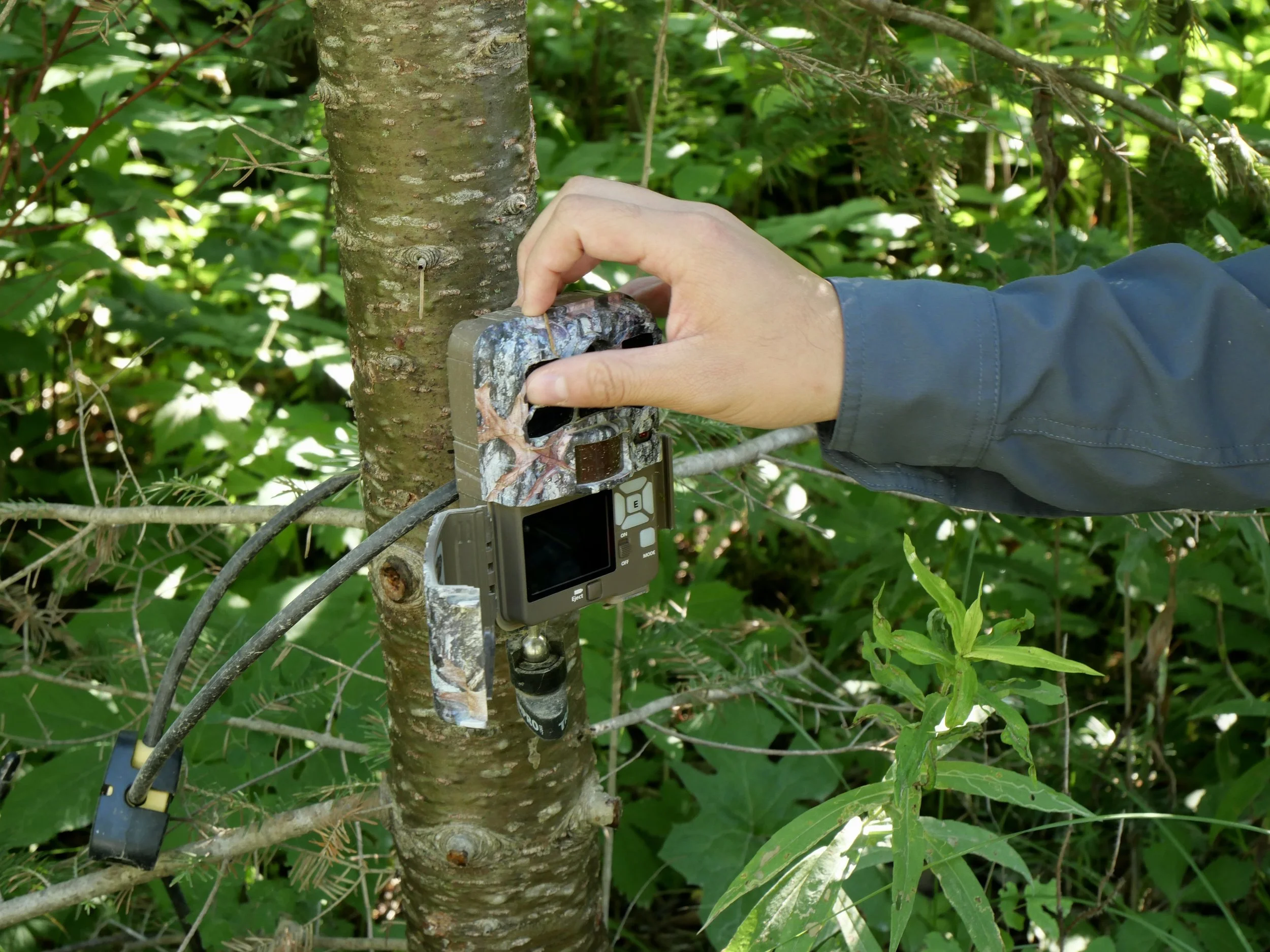 Ian maintaining trail cams for wolf ecology research / Credit: Margot Dupont
