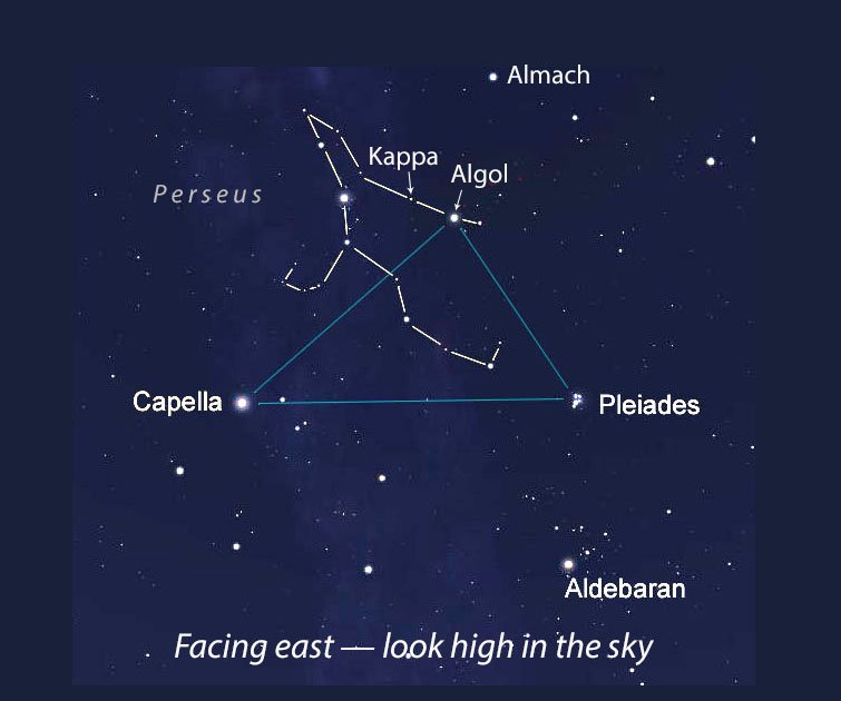 Jan. 9 – Algol the Demon Star dips to minimum brightness around 8 p.m. CST as its orbiting companion star eclipses it. By midnight, as it comes out of eclipse, it will re-brighten. Use the map to locate Algol. When brightest it's similar to Almach. At minimum it’s closer to Kappa Persei.