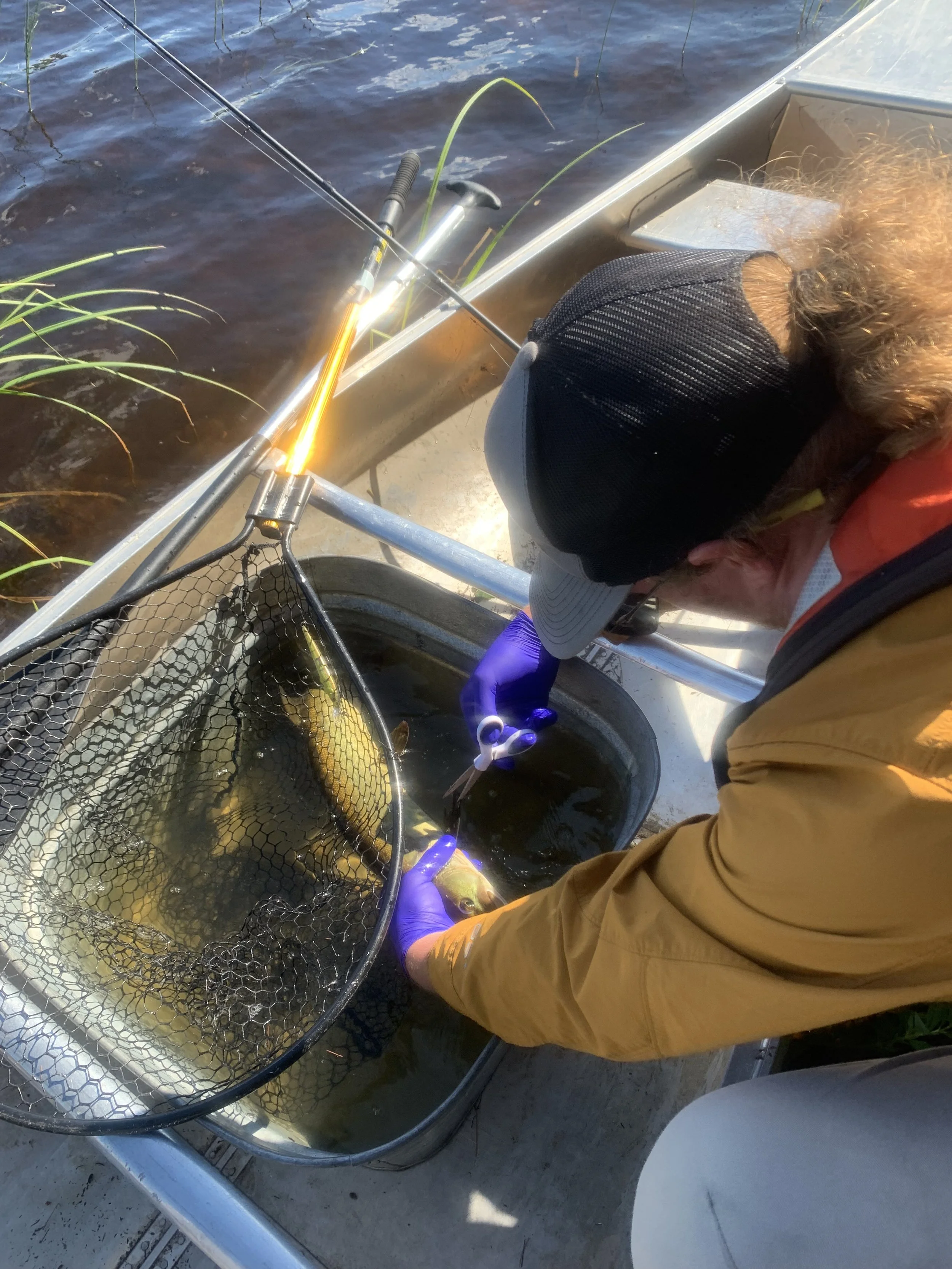 Once a muskie is caught, Jared records height and weight measurements, marks the capture, and takes a few fish scales to analyze the DNA record of the individual fish. These samples give the Aquatics team crucial insight on the potentially genetically distinct muskies and their population size.