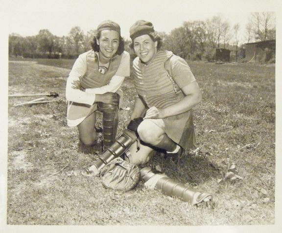 Julie Gutz as a catcher for the Kenosha Comets in 1950