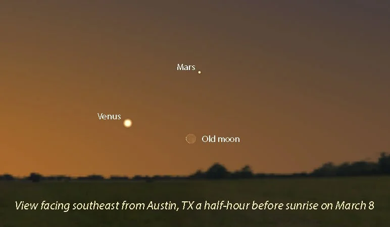 March 8 – Super-thin crescent moon forms a compact triangle with Venus and Mars very low in the southeastern sky a half-hour before sunrise. A nice triple gathering and probably the last time to spot Venus in the morning. Too low for northern U.S. observers but visible from the southern third of the country. Use binoculars. Find your local sunrise time at timeanddate.com/sun/
