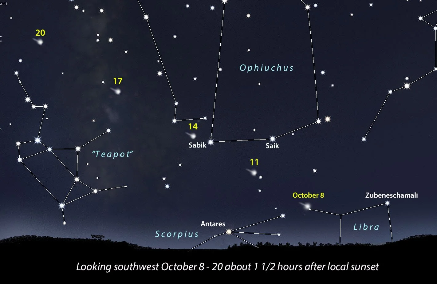 Oct. 8-20 – Best evening viewing of Comet SWAN (yes, yet another bright comet!) in binoculars and small telescopes as it travels low across the southwestern and southern sky at nightfall. Consult the map to know where to spot it.