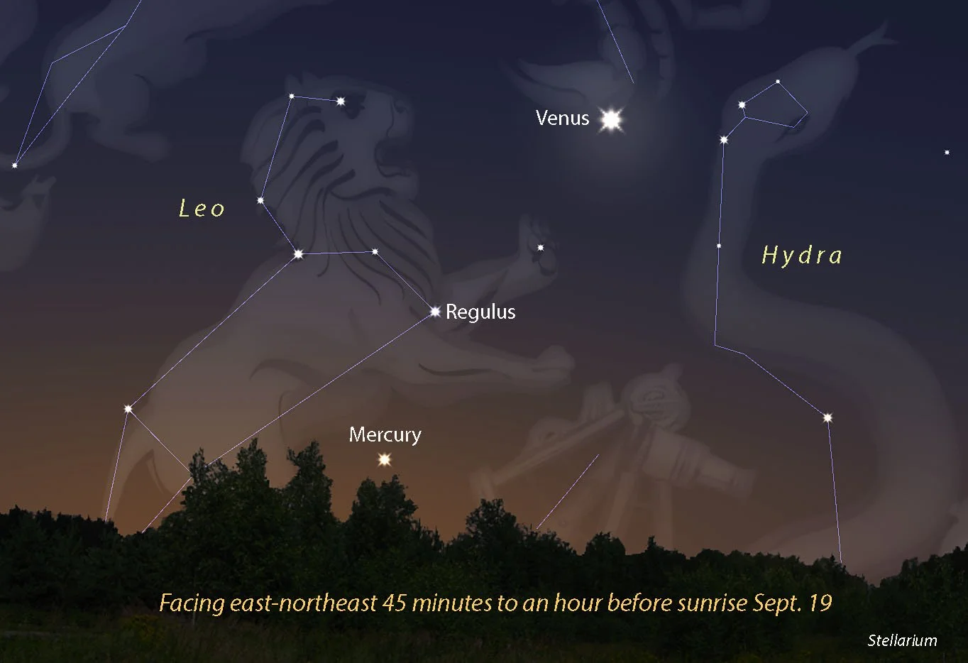 As summer transitions to fall Saturn and Jupiter light up the evening sky while Mercury and Venus grace the dawn. After a brief hiatus in the solar glare Venus rapidly climbs the eastern sky at dawn. You can’t miss it — no star blazes quite as brightly as this cloudy planet. Meanwhile, Mercury puts in its best morning appearance of the year for northern hemisphere observers. Look for it about three fists to the lower left of Venus from mid-to-late September.